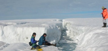 Examining the large north-south crack on the Ward Hunt Ice Shelf that drained the epishelf lake in Disraeli Fiord.